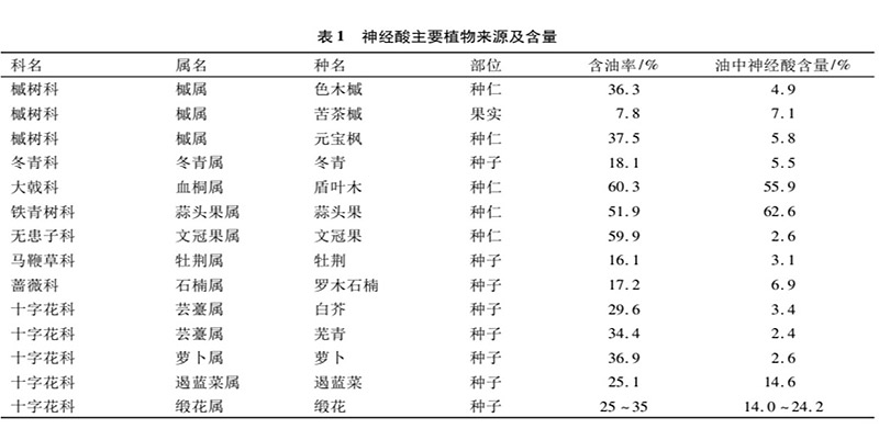 神经酸在预防和治 疗脑部疾病,提高免疫功能,改善皮肤等问题中都发挥了重要的作用。神经酸的来源起初是动物脑和鲨鱼油,但从这些原料中提取神经酸会有较大困难,原料缺乏,成本较高,而且来自动物的神经酸存在一定的安全隐患。因此,从植物油中提取神经酸是一条可持续发展的合理之路。在我国含神经酸的植物油脂中蒜头果、元宝枫、文冠果油发展潜力很大,元宝枫是我国含神经酸木本植物的一个特有物种,以元宝枫为代表的槭属,树种结实量大且元宝枫油中神经酸含量较高,是神经酸开发的有力资源,生产工艺采用“剥壳—低温压榨—低温萃取—精制—纯化”可得到富集神经酸的油脂。